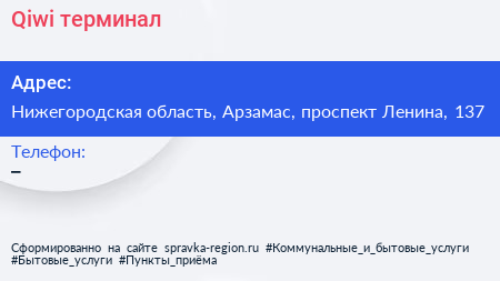 Qiwi, терминал по адресу Нижегородская область, Арзамас, проспект Ленина, 137 в дальнейшем Организация, размещена в следующих категориях: