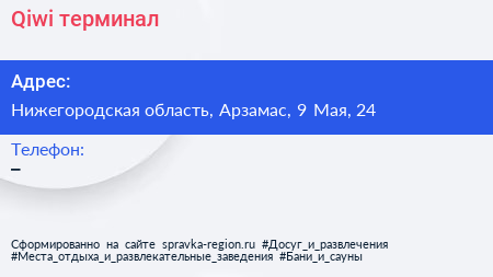 Qiwi, терминал по адресу Нижегородская область, Арзамас, 9 Мая, 24 в дальнейшем Организация, размещена в следующих категориях: