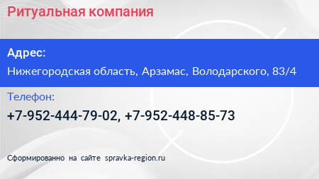 Ритуальная компания по адресу Нижегородская область, Арзамас, Володарского, 83/4 в дальнейшем Организация, размещена в следующих категориях: