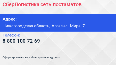 СберЛогистика, сеть постаматов по адресу Нижегородская область, Арзамас, Мира, 7 в дальнейшем Организация, размещена в следующих категориях: