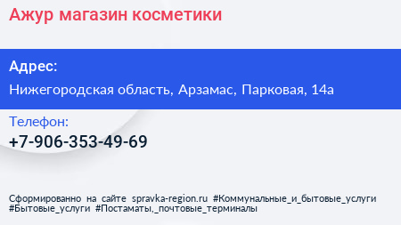 Ажур, магазин косметики по адресу Нижегородская область, Арзамас, Парковая, 14а в дальнейшем Организация, размещена в следующих категориях: