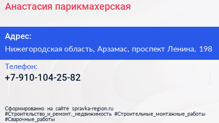 Анастасия, парикмахерская по адресу Нижегородская область, Арзамас, проспект Ленина, 198 в дальнейшем Организация, размещена в следующих категориях: