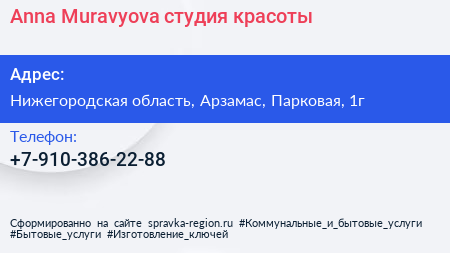 Anna Muravyova, студия красоты по адресу Нижегородская область, Арзамас, Парковая, 1г в дальнейшем Организация, размещена в следующих категориях: