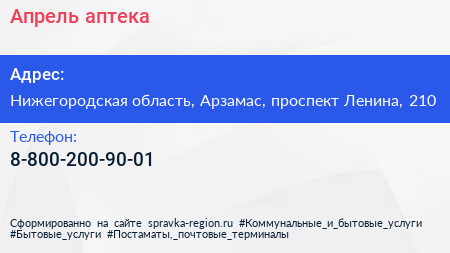 Апрель, аптека по адресу Нижегородская область, Арзамас, проспект Ленина, 210 в дальнейшем Организация, размещена в следующих категориях: