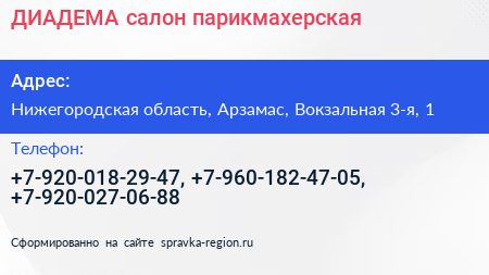 ДИАДЕМА, салон-парикмахерская по адресу Нижегородская область, Арзамас, Вокзальная 3-я, 1 в дальнейшем Организация, размещена в следующих категориях: