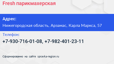 Fresh, парикмахерская по адресу Нижегородская область, Арзамас, Карла Маркса, 57 в дальнейшем Организация, размещена в следующих категориях: