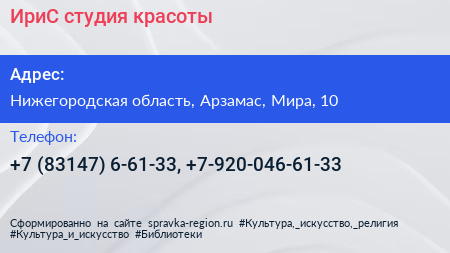 ИриС, студия красоты по адресу Нижегородская область, Арзамас, Мира, 10 в дальнейшем Организация, размещена в следующих категориях: