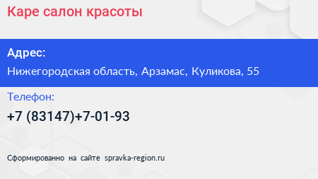 Каре, салон красоты по адресу Нижегородская область, Арзамас, Куликова, 55 в дальнейшем Организация, размещена в следующих категориях: