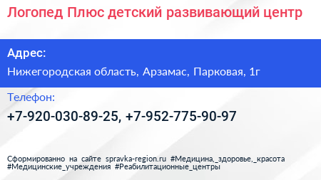 Логопед Плюс, детский развивающий центр по адресу Нижегородская область, Арзамас, Парковая, 1г в дальнейшем Организация, размещена в следующих категориях: