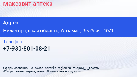 Максавит, аптека по адресу Нижегородская область, Арзамас, Зелёная, 40/1 в дальнейшем Организация, размещена в следующих категориях: