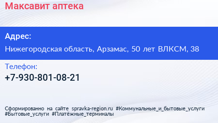 Максавит, аптека по адресу Нижегородская область, Арзамас, 50 лет ВЛКСМ, 38 в дальнейшем Организация, размещена в следующих категориях: