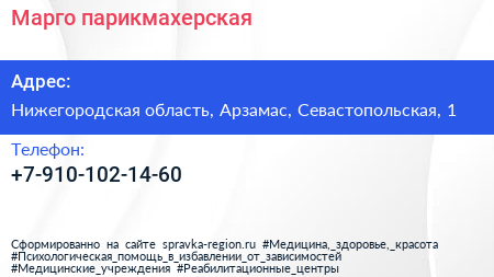 Марго, парикмахерская по адресу Нижегородская область, Арзамас, Севастопольская, 1 в дальнейшем Организация, размещена в следующих категориях: