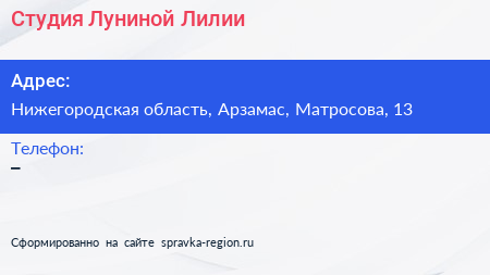 Студия Луниной Лилии по адресу Нижегородская область, Арзамас, Матросова, 13 в дальнейшем Организация, размещена в следующих категориях:
