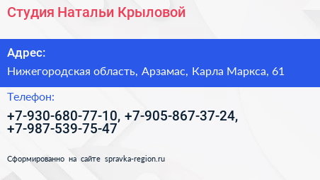 Студия Натальи Крыловой по адресу Нижегородская область, Арзамас, Карла Маркса, 61 в дальнейшем Организация, размещена в следующих категориях: