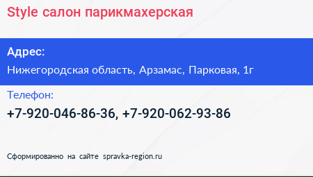 Style, салон-парикмахерская по адресу Нижегородская область, Арзамас, Парковая, 1г в дальнейшем Организация, размещена в следующих категориях: