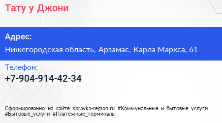 Тату у Джони по адресу Нижегородская область, Арзамас, Карла Маркса, 61 в дальнейшем Организация, размещена в следующих категориях: