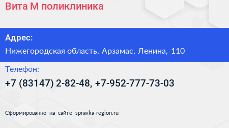 Вита-М, поликлиника по адресу Нижегородская область, Арзамас, Ленина, 110 в дальнейшем Организация, размещена в следующих категориях: