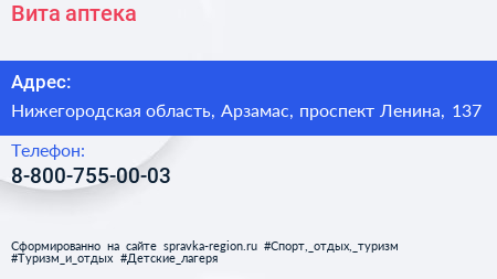 Вита, аптека по адресу Нижегородская область, Арзамас, проспект Ленина, 137 в дальнейшем Организация, размещена в следующих категориях: