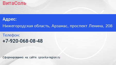 ВитаСоль по адресу Нижегородская область, Арзамас, проспект Ленина, 208 в дальнейшем Организация, размещена в следующих категориях: