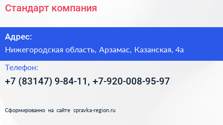 Стандарт, компания по адресу Нижегородская область, Арзамас, Казанская, 4а в дальнейшем Организация, размещена в следующих категориях: