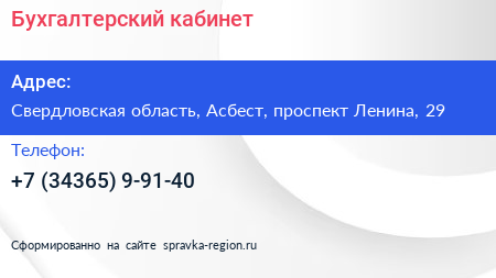 Бухгалтерский кабинет по адресу Свердловская область, Асбест, проспект Ленина, 29 в дальнейшем Организация, размещена в следующих категориях: