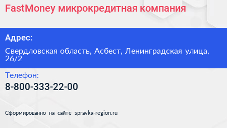 FastMoney, микрокредитная компания по адресу Свердловская область, Асбест, Ленинградская улица, 26/2 в дальнейшем Организация, размещена в следующих категориях:
