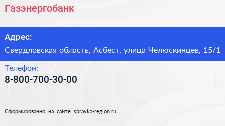 Газэнергобанк по адресу Свердловская область, Асбест, улица Челюскинцев, 15/1 в дальнейшем Организация, размещена в следующих категориях: