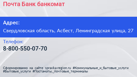 Почта Банк, банкомат по адресу Свердловская область, Асбест, Ленинградская улица, 27 в дальнейшем Организация, размещена в следующих категориях: