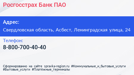 Росгосстрах Банк, ПАО по адресу Свердловская область, Асбест, Ленинградская улица, 24 в дальнейшем Организация, размещена в следующих категориях:
