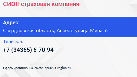 СИОН, страховая компания по адресу Свердловская область, Асбест, улица Мира, 6 в дальнейшем Организация, размещена в следующих категориях: