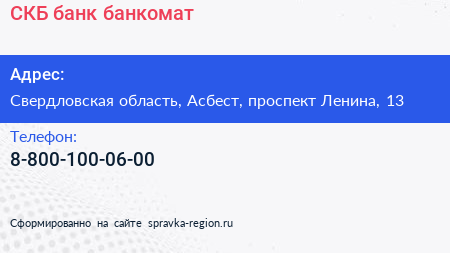 СКБ-банк, банкомат по адресу Свердловская область, Асбест, проспект Ленина, 13 в дальнейшем Организация, размещена в следующих категориях: