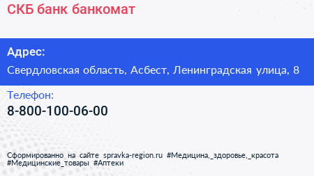 СКБ-банк, банкомат по адресу Свердловская область, Асбест, Ленинградская улица, 8 в дальнейшем Организация, размещена в следующих категориях: