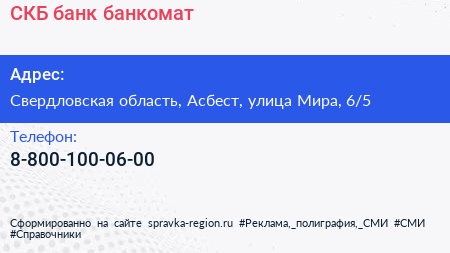 СКБ-банк, банкомат по адресу Свердловская область, Асбест, улица Мира, 6/5 в дальнейшем Организация, размещена в следующих категориях:
