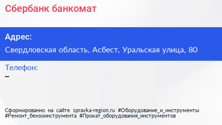 Сбербанк, банкомат по адресу Свердловская область, Асбест, Уральская улица, 80 в дальнейшем Организация, размещена в следующих категориях: