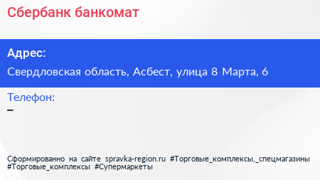 Сбербанк, банкомат по адресу Свердловская область, Асбест, улица 8 Марта, 6 в дальнейшем Организация, размещена в следующих категориях: