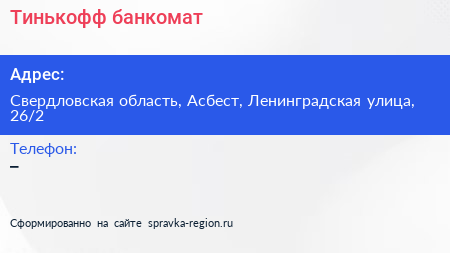 Тинькофф, банкомат по адресу Свердловская область, Асбест, Ленинградская улица, 26/2 в дальнейшем Организация, размещена в следующих категориях: