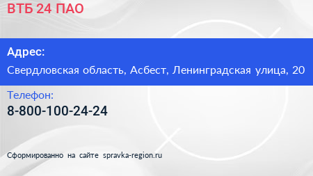ВТБ 24, ПАО по адресу Свердловская область, Асбест, Ленинградская улица, 20 в дальнейшем Организация, размещена в следующих категориях: