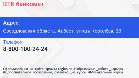 ВТБ, банкомат по адресу Свердловская область, Асбест, улица Королёва, 28 в дальнейшем Организация, размещена в следующих категориях: