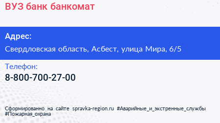 ВУЗ-банк, банкомат по адресу Свердловская область, Асбест, улица Мира, 6/5 в дальнейшем Организация, размещена в следующих категориях: