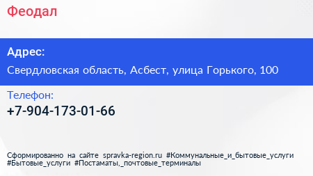 Феодал по адресу Свердловская область, Асбест, улица Горького, 100 в дальнейшем Организация, размещена в следующих категориях: