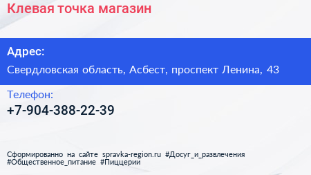 Клевая точка, магазин по адресу Свердловская область, Асбест, проспект Ленина, 43 в дальнейшем Организация, размещена в следующих категориях: