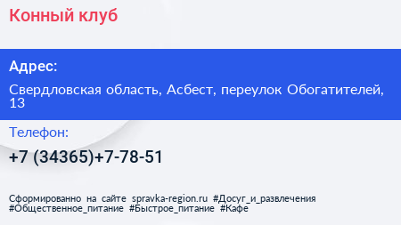 Конный клуб по адресу Свердловская область, Асбест, переулок Обогатителей, 13 в дальнейшем Организация, размещена в следующих категориях: