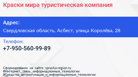 Краски мира, туристическая компания по адресу Свердловская область, Асбест, улица Королёва, 28 в дальнейшем Организация, размещена в следующих категориях: