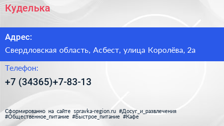 Куделька по адресу Свердловская область, Асбест, улица Королёва, 2а в дальнейшем Организация, размещена в следующих категориях: