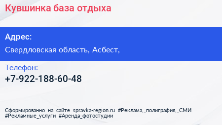 Кувшинка, база отдыха по адресу Свердловская область, Асбест, в дальнейшем Организация, размещена в следующих категориях:
