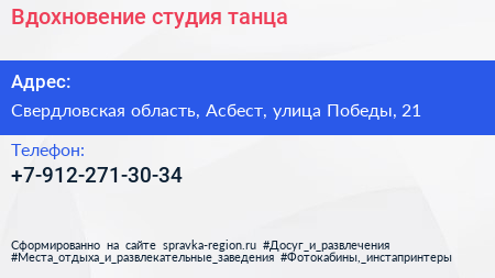 Вдохновение, студия танца по адресу Свердловская область, Асбест, улица Победы, 21 в дальнейшем Организация, размещена в следующих категориях: