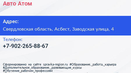 Авто-Атом по адресу Свердловская область, Асбест, Заводская улица, 4 в дальнейшем Организация, размещена в следующих категориях:
