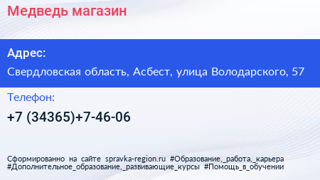 Медведь, магазин по адресу Свердловская область, Асбест, улица Володарского, 57 в дальнейшем Организация, размещена в следующих категориях: