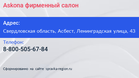 Askona, фирменный салон по адресу Свердловская область, Асбест, Ленинградская улица, 43 в дальнейшем Организация, размещена в следующих категориях: