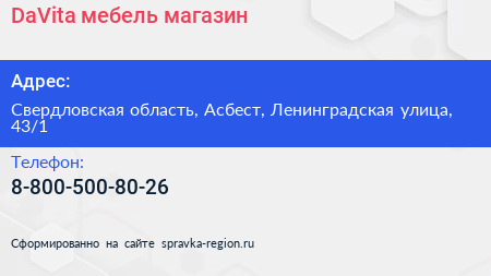 DaVita-мебель, магазин по адресу Свердловская область, Асбест, Ленинградская улица, 43/1 в дальнейшем Организация, размещена в следующих категориях: